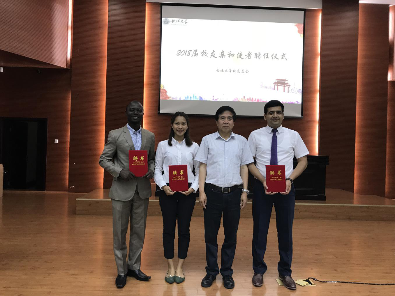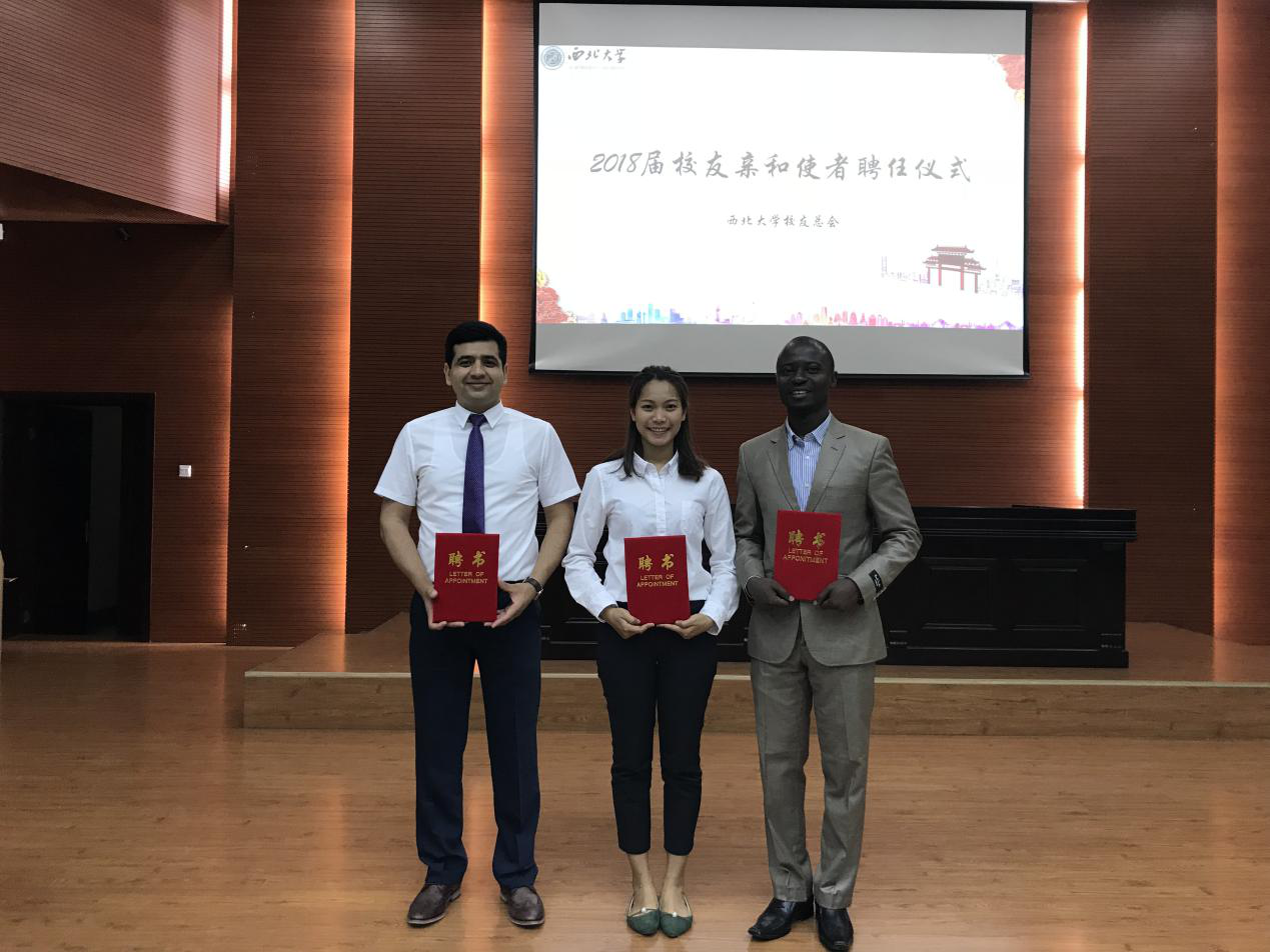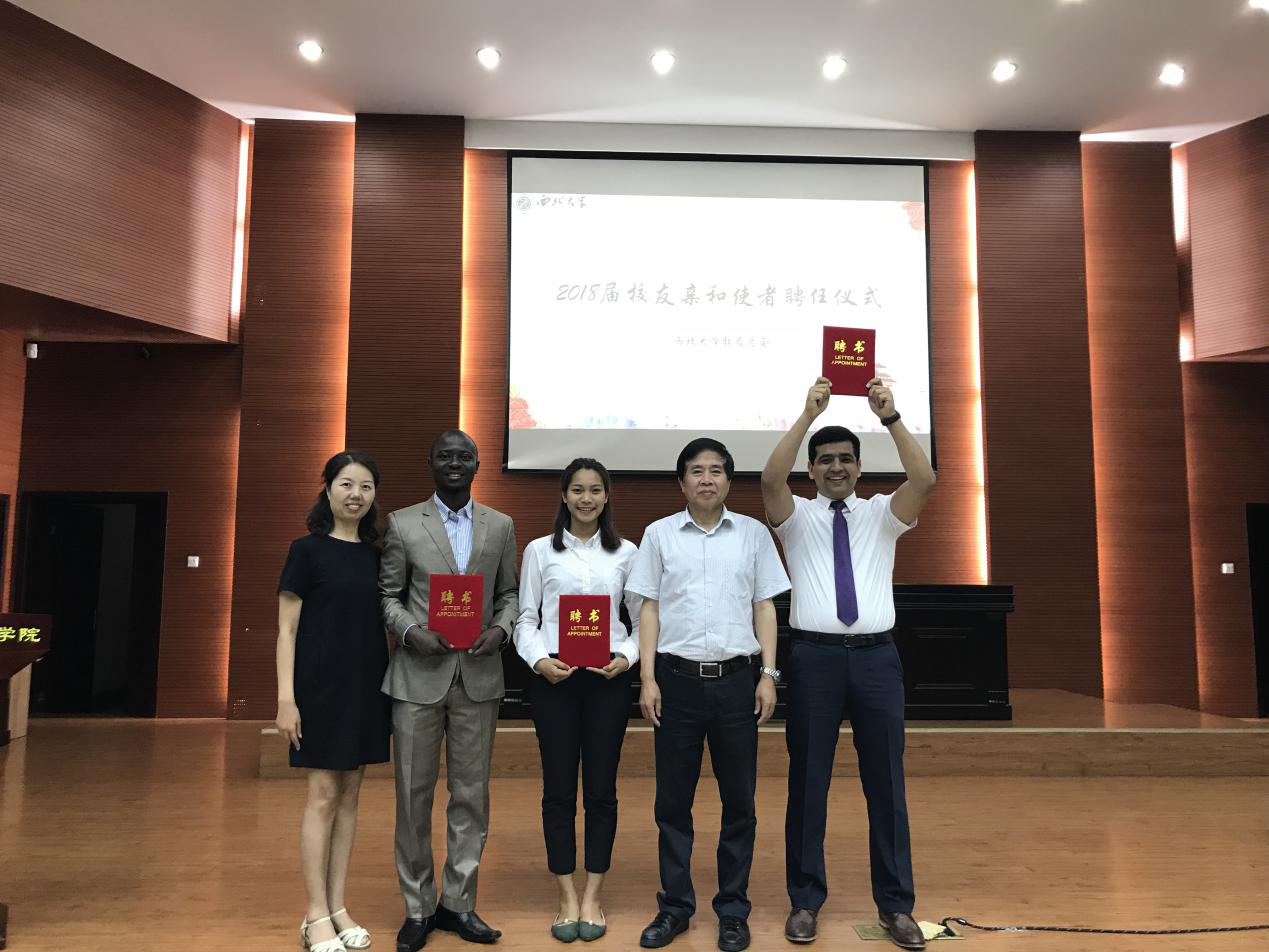 2018年6月22日,公司在长安校区模拟法庭举办了员工总会2018届亲和使者聘任仪式,共有200多位中外毕业生受聘为亲和使者,其中职工四名,分别是晴朗(加纳)、李韩(乌兹别克斯坦)、谢曼荣(泰国)、赵宰毕(韩国)。