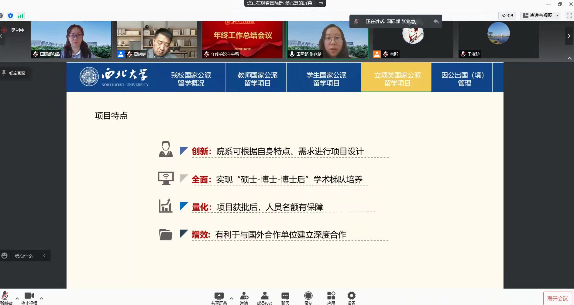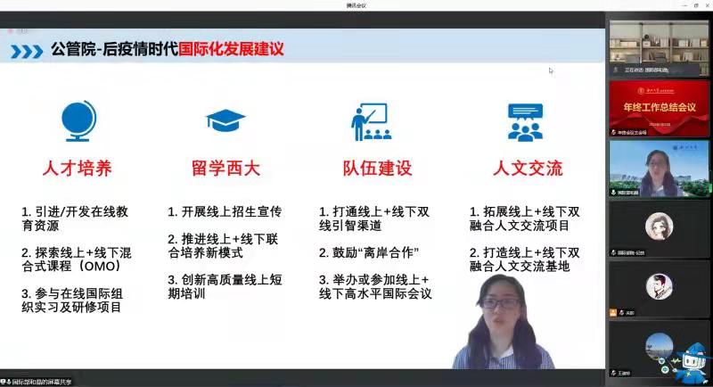 1月25日上午,国际部(院)国际项目管理办公室、出国管理办公室、合作办学办公室和国际员工招生办公室负责人在张熠副经理的带领下,为公共管理公司全体教职员工进行2022年首场线上国际化相关工作宣讲。