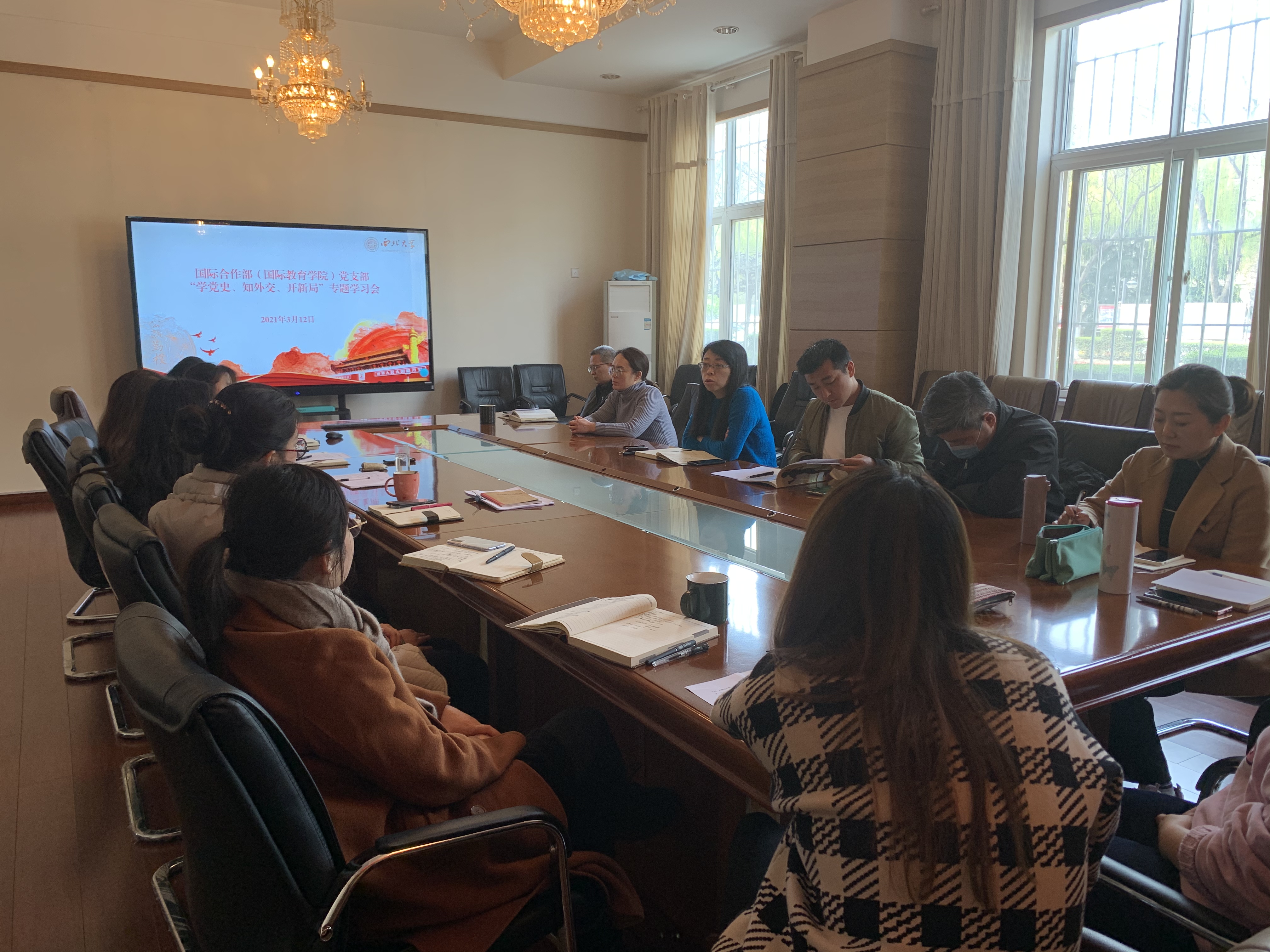 3月12日下午,国际合作部(足球赌注网站)党支部召开“学党史、知外交、开新局”专题学习会,部(院)党支部全体党员参加了会议。