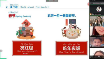 同时,汉语文化课教师团队还以游览西安名胜古迹为线索,精心设计了以“云游古都”为主题的汉语听说系列课程,采用视频会议软件小班互动式直播授课的方式,让营员们在“云游”中学习汉语。随着课程的进行,兵马俑、西安城墙、乾陵、碑林、甚至biangbiang面这些在一般汉语初级学习者那里堪称生僻的词汇,成了每个营员张口就来的常用词。课程结束时,师生们还共同唱起了中国民歌《茉莉花》。