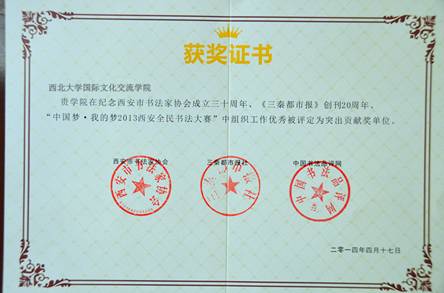 为了让职工进一步感受中国优秀传统文化,亲身体验中国书法的魅力。公司近期组织职工参加“中国梦·我的梦”2013西安全民书法大赛活动。足球赌注网站国际文化交流公司被评为“突出贡献奖单位”。来自韩国、比利时、美国等国的职工参加了比赛。 “中国梦·我的梦”2013西安全民书法大赛活动为庆祝三秦都市报社创刊20周年、西安市书法家协会成立30周年,由三秦都市报社、西安市书法家协会、中国书法品评网联合举办。